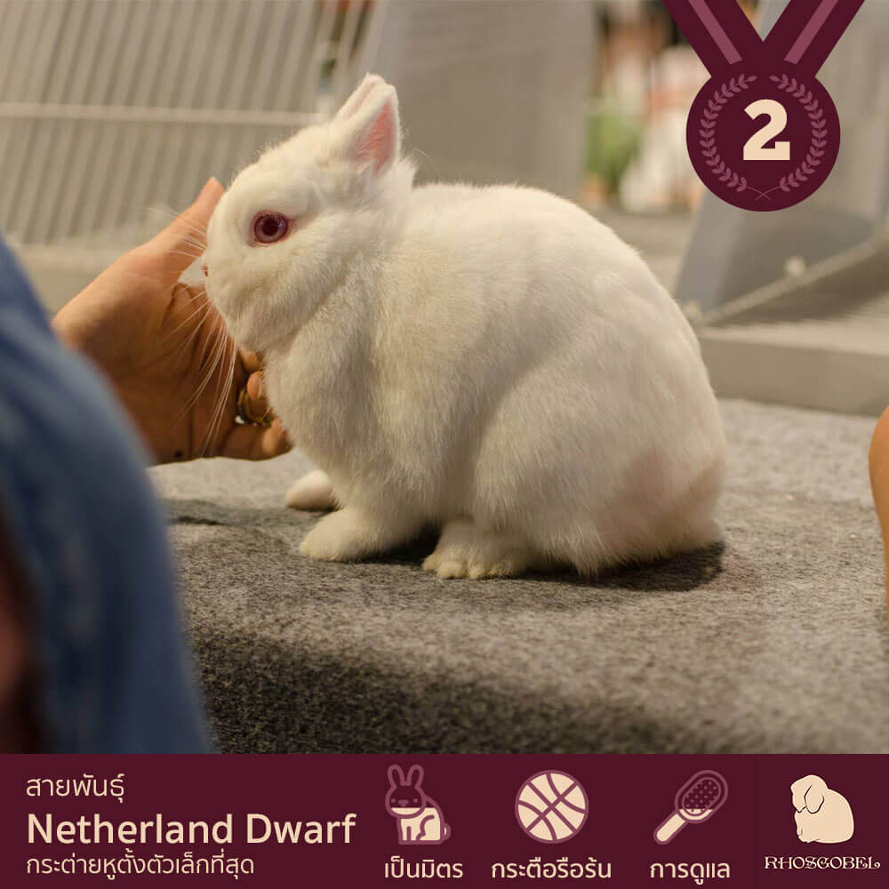 สายพันธุ์ยอดฮิตไม่แพ้ Holland Lop คือ Netherland Dwarf นิยมเรียกกันว่า ND เป็นสายพันธุ์ที่ตัวเล็กที่สุดในบรรดา 5 สายพันธุ์ที่กล่าวมา ลักษณะเด่นของสายพันธุ์ก็คือเรื่องของขนาดตัวและหูที่ตั้งชิดกันของเขา Netherland Dwarf เป็นสายพันธุ์ที่มีความกระตือรือล้นสูงมาก กระฉับกระเฉง แต่คุณอาจจะต้องใช้เวลาในการตีซี้กับเขามากหน่อย